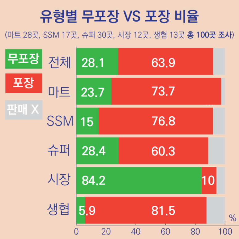 대형마트 중에서는 하나로클럽, 홈플러스, 롯데마트, 이마트 순으로 무포장 비율이 높았다. 사실 무포장 점수가 가장 높은 하나로클럽도 포장제품이 약 60%를 차지한다. 그러니 다른 마트들은 무슨 말이 필요할까. (버럭) 1등 마트는 포장도 1등인가요. 왜왜!! 잘 팔리면 벌크로 좀 까놓고 팔면 안 되나요?
