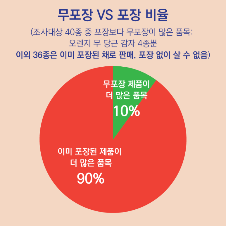 포장되지 않고 낱개로 구입 가능한 제품이 포장된 제품보다 많은 경우는 딱 4종, 10%로 감자, 당근, 무, 오렌지 뿐이다.