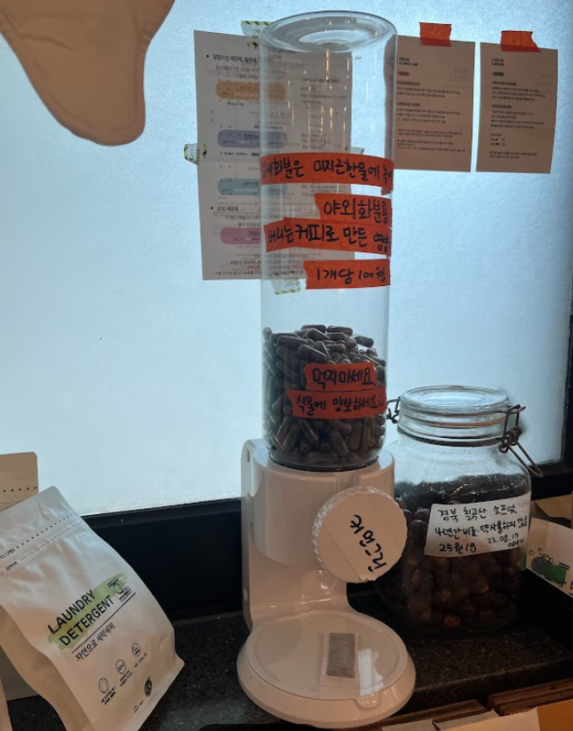알맹상점 망원에는 때마침 커먼그라운드가 만든 커피비료를 한알씩 판매하고 있어요. 또 페트병에 끼워 쓰는 물조리개 뚜껑 마개도 판매해요. 또 종이화분과 코코넛 화분 등 식물 덕후님들이 쓰레기 걱정 없이 식물과 생활할 수 있는 물건도 있으니 둘러보세요:)