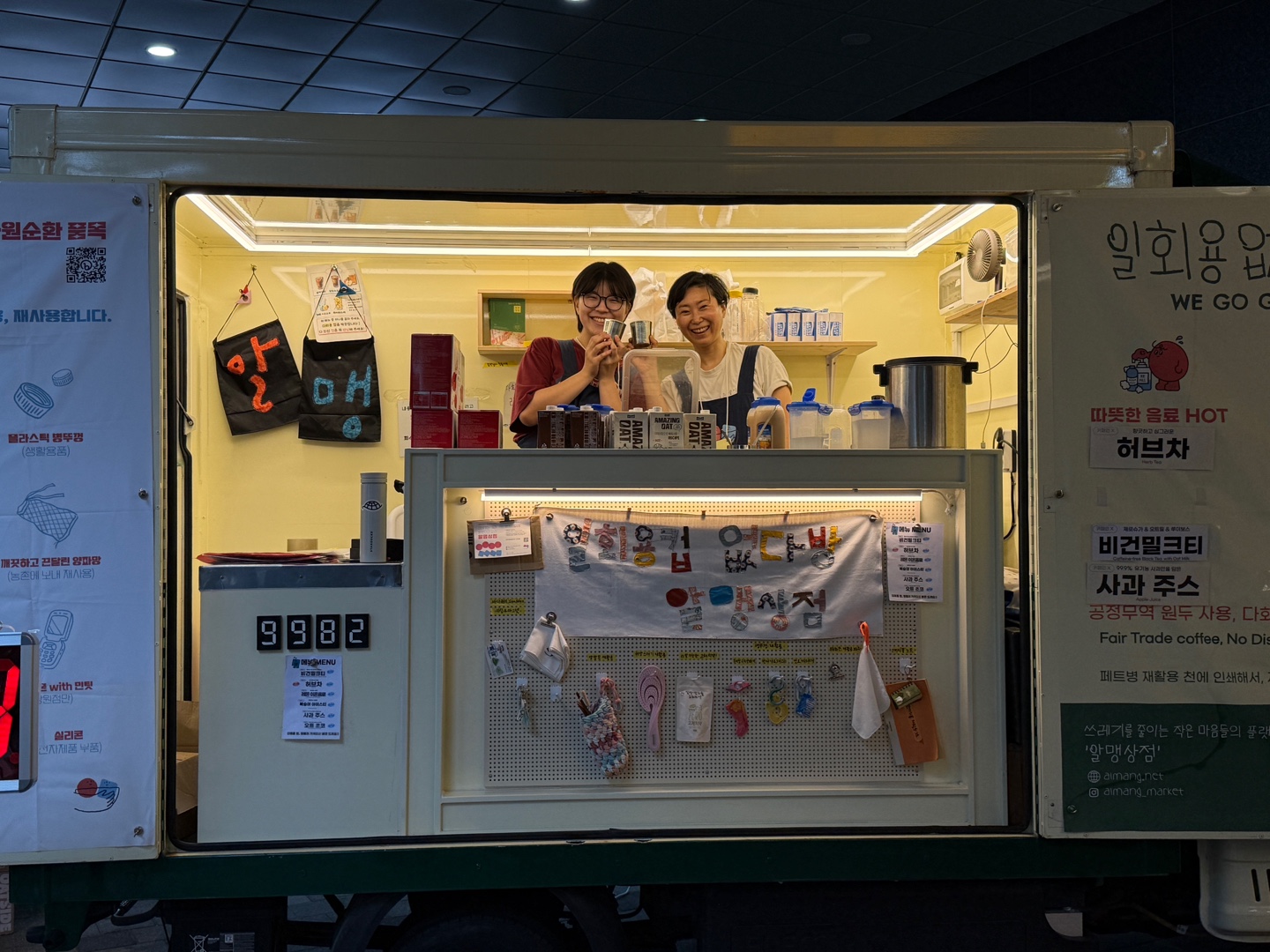 국내산 복숭아 아티스티, 비건 밀크티, 레몬이온음료, 공정무역 루이보스 차 등 동물성 성분 없고 일회용품도 없는 일회용 없다방 음료를 선보였어요.
