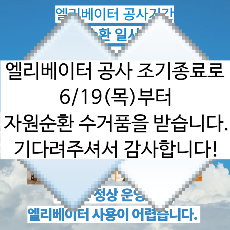 엘리베이터 수리가 조기 종료되어 6월 19일(목)부터 자원순환 수거품을 받습니다❤