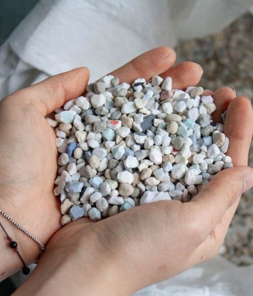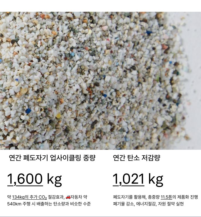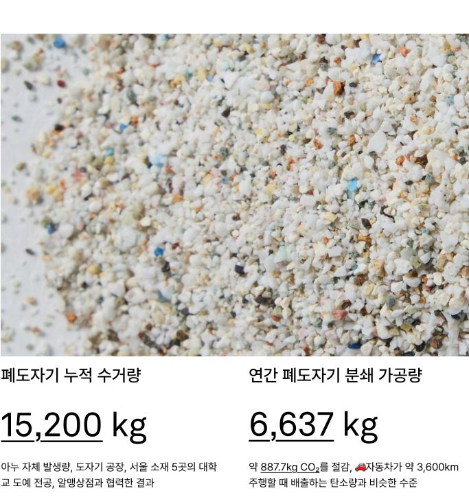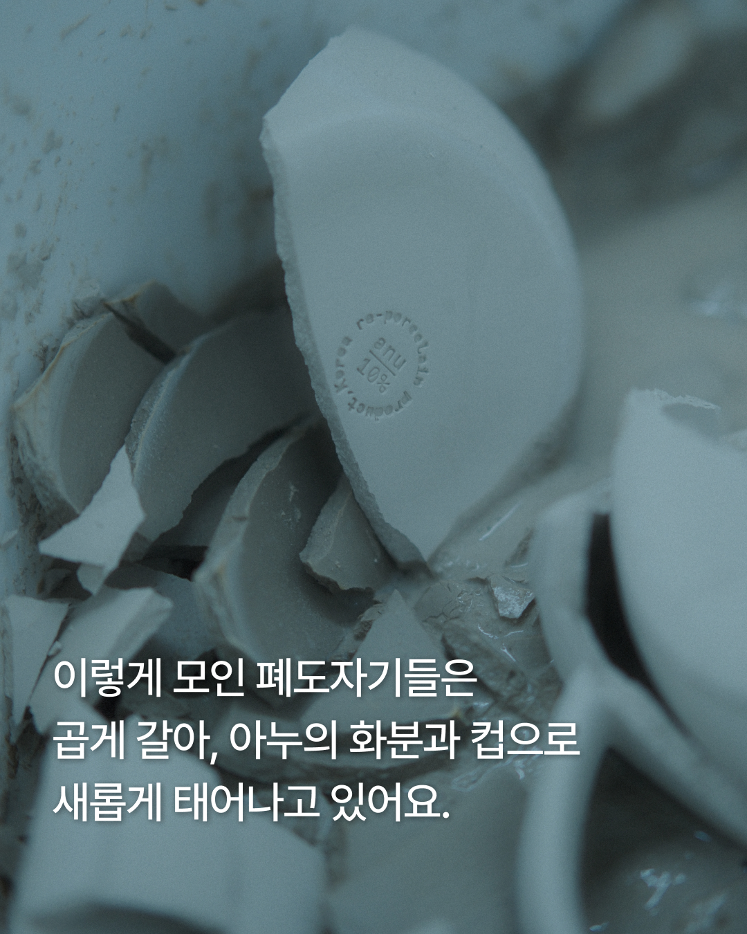 그 결과 무려 700kg 가까이의 폐도자기를 알맹러들과 함께 모았습니다. 아누는 알맹상점 이외에도 여러 기관과 손잡고, 총 15톤이 넘는 폐도자기를 재료로 만들어 컵, 화분 등 새로운 제품으로 만들었다고 합니다. 심지어 건축자재인 타일로도 만들어서 아주 고급진 자재를 내놓았습니다.