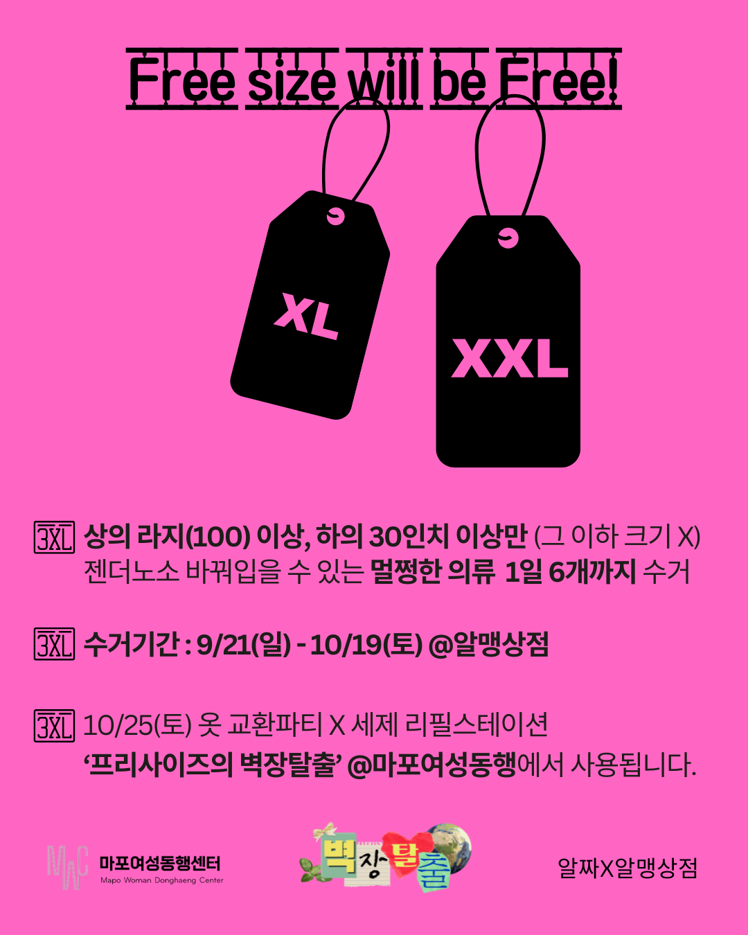 10월 25일(토) 마포여성동행에서 운영될 '프리사이즈의 벽장탈출' 옷 교환파티를 위해 '레알' 프리 사이즈 옷을 미리 수거합니다.