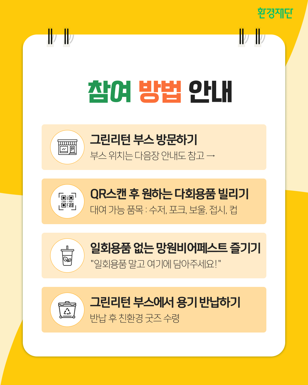 - 그린리턴에서 빌린 다회용품 망원시장에서 마음껏 사용하세요.