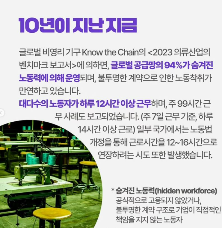 방글라데시 라나플라자 붕괴사고를 기억하시나요? 패스트패션 공장이 무너져 생떼같은 여성노동자들이 부서졌던 비극이요😢😭 이후 10년이 지난 지금도 패션 산업은 착취와 파괴를 밑거름 삼아 성장하고 있습니다.